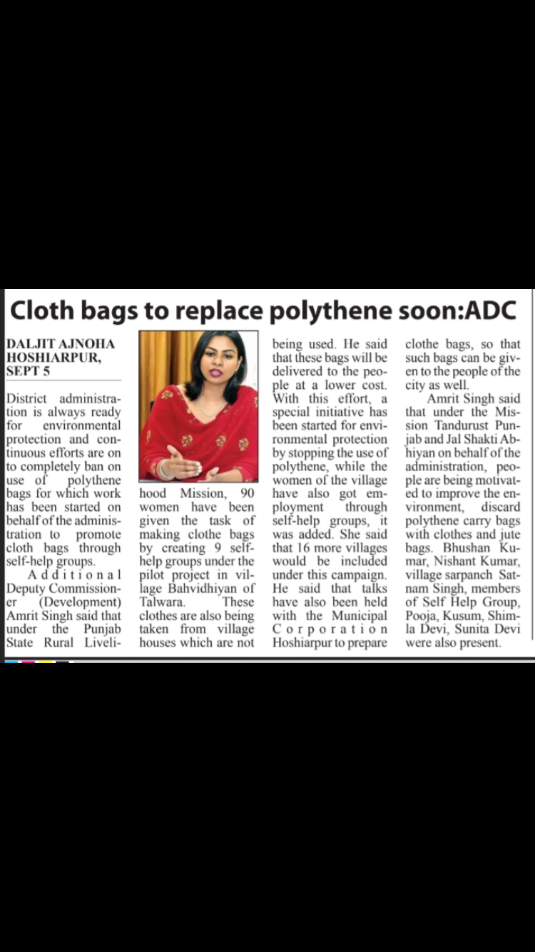 The administration under Additional Deputy Commissioner Development has converged the scheme of State Rural Livelihood Mission, Mission Tandarust Punjab, Jal shakti Abhiyaan and Ghar Ghar Rozgar to achieve a movement towards replacement of plastic bags with cloth bags in rural areas